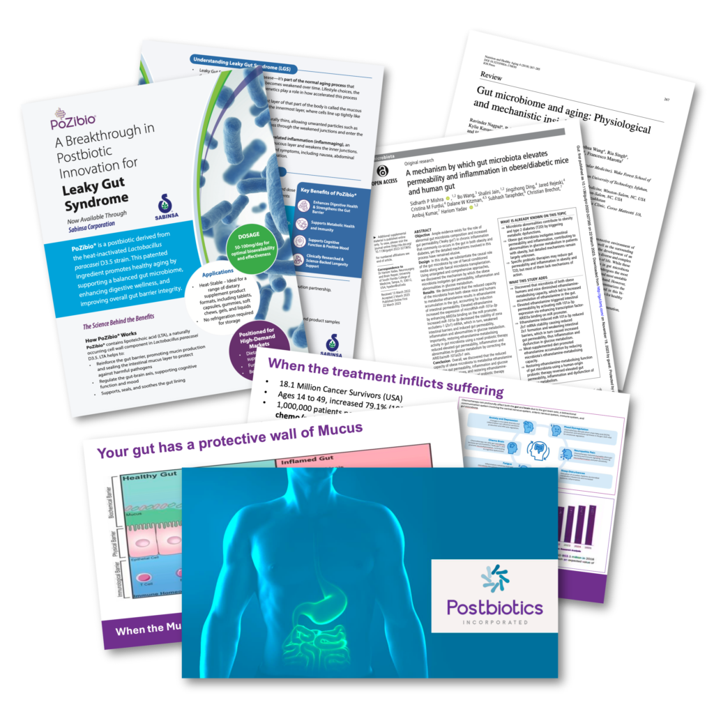 Postbiotics Inc. (PBI) researches and develops non-prescription, scientifically proven, bioactive health solutions for a longer and healthier human lifespan. Our science delivers the benefits originally hoped for, but rarely substantially validated in, probiotics and other digestive health ingredients. PBI offers commercial-ready, patent-protected ingredients for age related conditions. Our current products and robust pipeline support nutrition, microbiome balance, neuroprotection, mitochondrial function, healthier skin, and strengthened immunity. Our lead postbiotic, PoZibio®, the next generation of digestive health®, is suitable for use in dietary supplements, functional foods, and medical foods. Developed by Wake Forest University Health Sciences, newly patented PoZibio® has demonstrated efficacy for extending the healthiest years of life (healthspan), extending lifespan, and mitigating the effects associated with Leaky Gut Syndrome and other digestive health conditions.